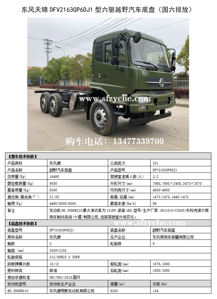 東風天錦DFV2163GP6DJ1型六驅越野汽車底盤參數(shù),國六排放六驅天錦系列公告在第331批《道路機動車輛生產企業(yè)及產品公告》新產品公示中已公示,公示完成即可正常上戶。