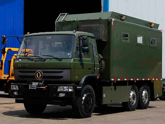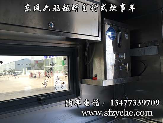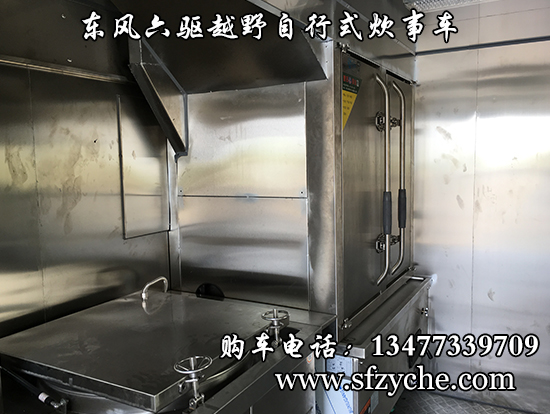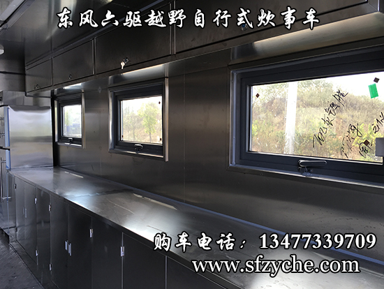 東風(fēng)六驅(qū)越野自行式炊事車車輛概述:采用東風(fēng)六驅(qū)越野底盤(pán)改裝, 車廂材質(zhì)采用外冷軋鋼板,內(nèi)飾不銹鋼,中間保溫層,隱藏式上車踏步,頂部安全窗,兩個(gè)高原副食灶,一個(gè)高原蒸飯車,抽油煙機(jī),平冷柜,水路,電路,油路等。